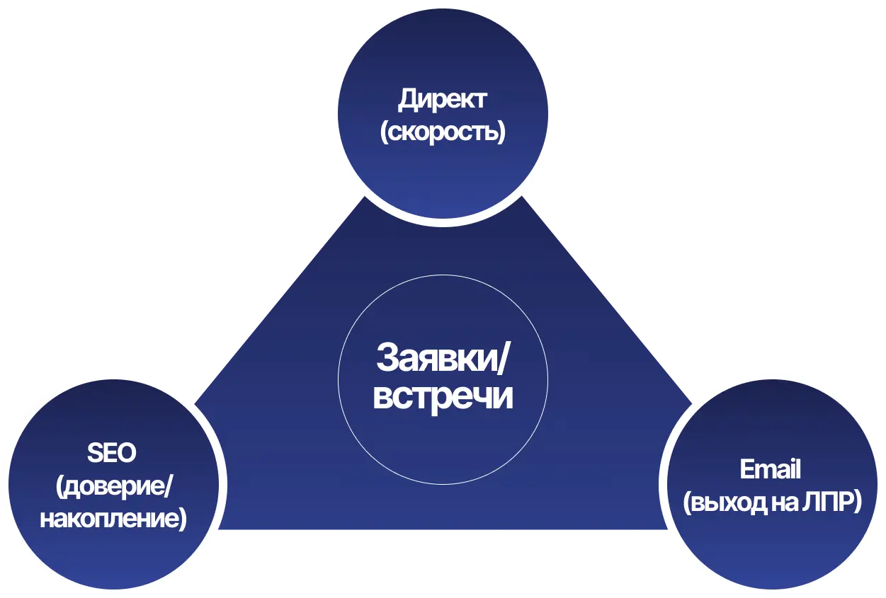 SEO + Директ + email‑аутрич дают эффект “накопления”: вы ловите спрос, догреваете сомневающихся и возвращаете ЛПР к диалогу.